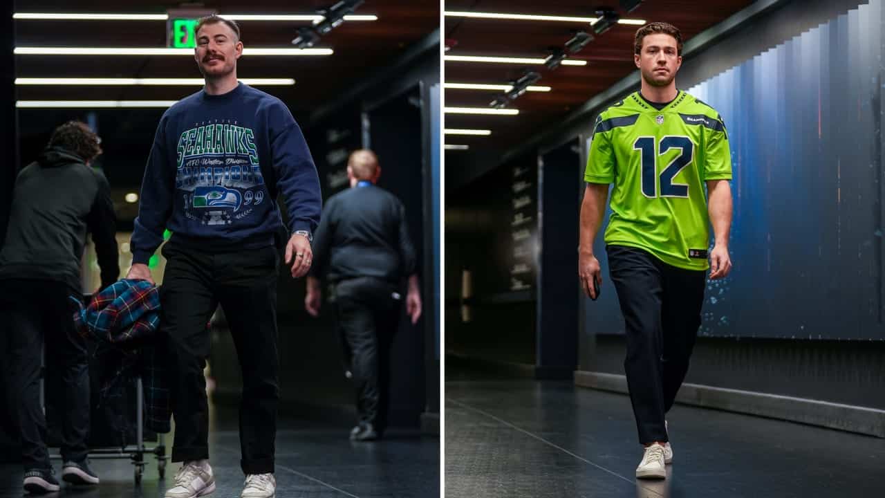 Share Facebook Twitter LinkedIn Pinterest Email Игроки приезжают в экипировке Сиэтла, чтобы поболеть за соседнюю команду НФЛ. Read Full Article Читать: Лунделл берет Кубок Стэнли в парк развлечений в Финляндии