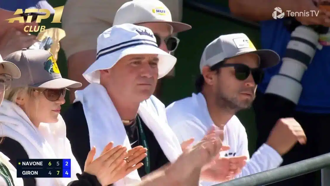 Андре Агасси наблюдает за выступлением Маркоса Хирона в среду в Индиан-Уэллсе.