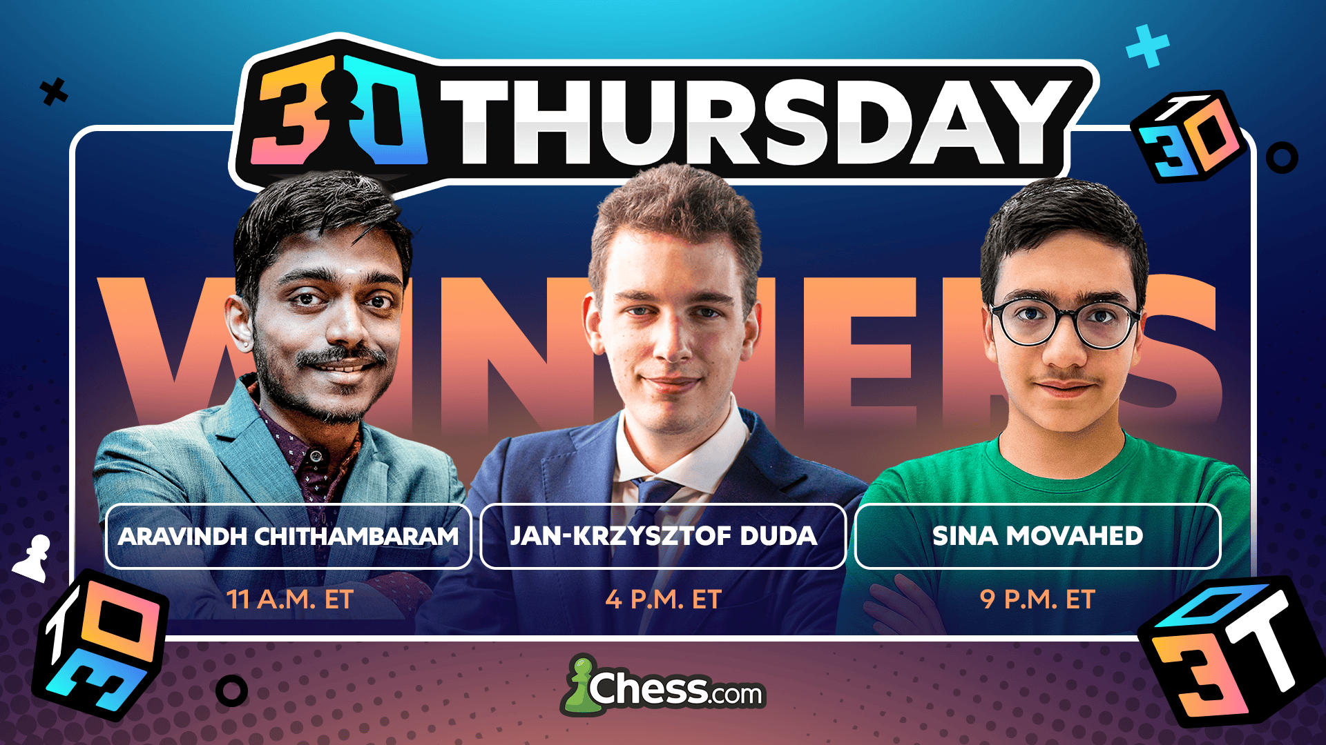3 0 Четверг — это серия из трех еженедельных швейцарских турниров для проверенных титулованных игроков с любимым контролем времени. Каждый из трех турниров представляет собой 11-туровый швейцарский турнир с контролем времени 3+0. Общий призовой фонд составляет $3000 каждую неделю.